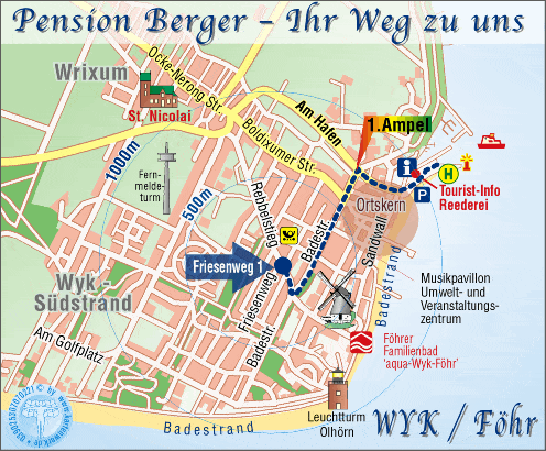 Vom Hafen kommend, erreichen Sie uns entweder per Taxi, mit dem Bus; von der Haltestelle „Hafen“ fahren Sie zur Haltestelle „Museum“ und laufen von dort aus rechts in den Rebbelstieg und biegen links in den Friesenweg ein, oder Sie laufen anhand der Karte vom Hafen aus zur Pension.